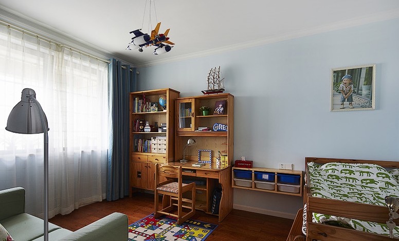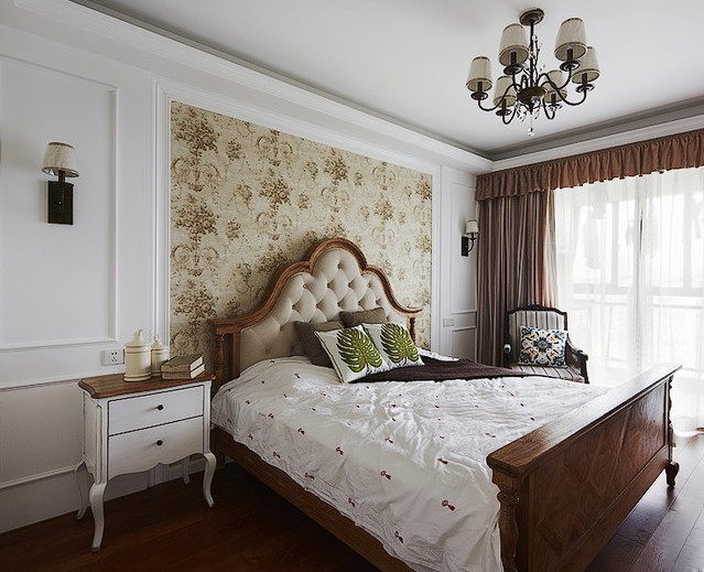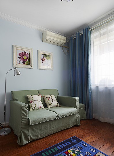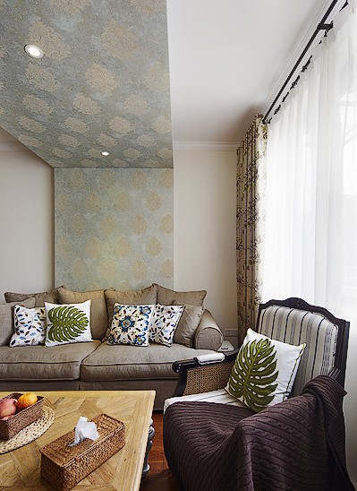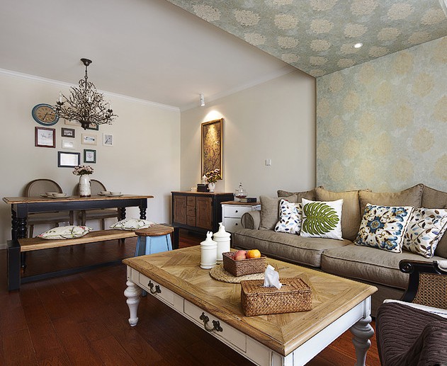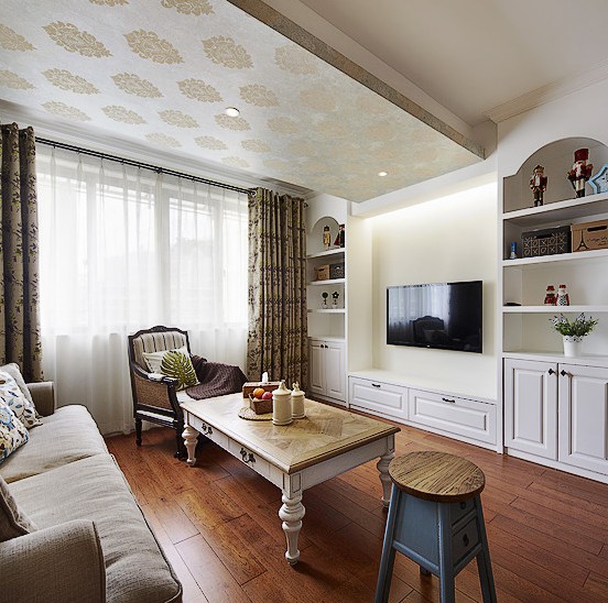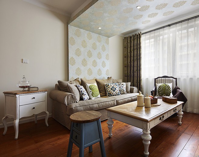 客厅的美式风格(美式风格休闲小清新设计装修效果图)窗帘也非常的清新田园。很明亮的客厅装修案例,客厅的吊顶铁艺风格的田园吊灯。