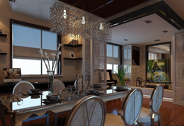 银色奢华欧式三居室装修家居设计效果图,奢华典雅的客厅设计充满着现代化的格调,天花板的设计(天花板装修材料的多样化)天花板装修材料的多样化)很有特点,镜面式瓷砖的设计搭配上吊灯为整个空间营造了明亮舒朗的感受装修案例,