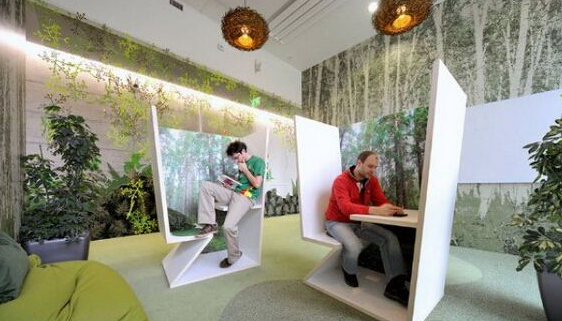 这样的办公室充分融入大自然的因素,鸟巢状的吊灯,悬挂的植物,极强的立体感,办公的桌椅也很个性,置身这样的环境中办公,一定会心情大好,充满活力。