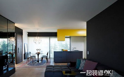 一间客厅和餐厅合于一的大起居室有着大气的感觉。深色的转角布艺沙发敦敦实实地坐落于客厅的靠墙部分,极具气势却也显得沉闷。于是点缀上折线图案的条纹靠包,为客厅带来活跃的气氛,而介入其中的木质茶几则为房间增添了质感。 -