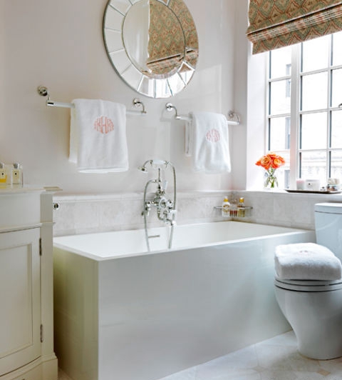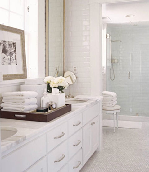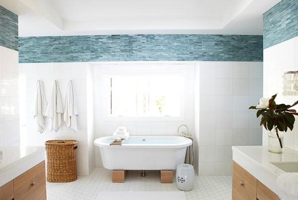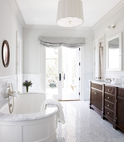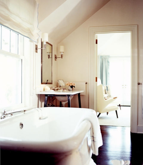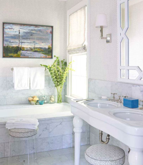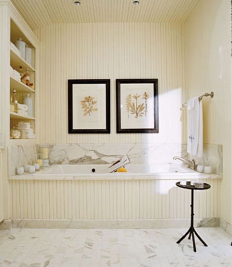 10、普通的浴缸、大理石地砖,釉面和浴缸白色营造出清新的绿洲。