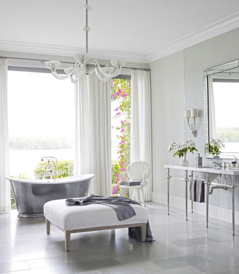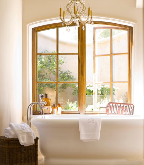 9、象牙白的墙壁、古典的吊灯,加上私人封闭花园的景色、让浴室仿佛成了观景台。