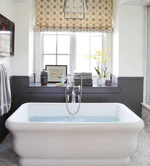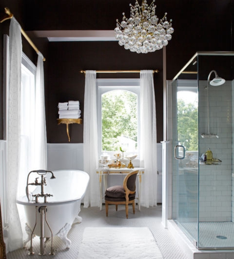 15、巧克力色让白色瓷砖、窗帘、浴缸更加亮白,20世纪80年代的水晶吊灯增加了古典的魅力。