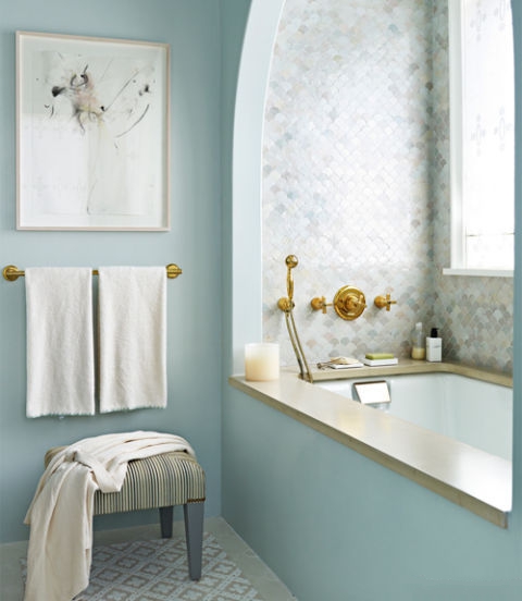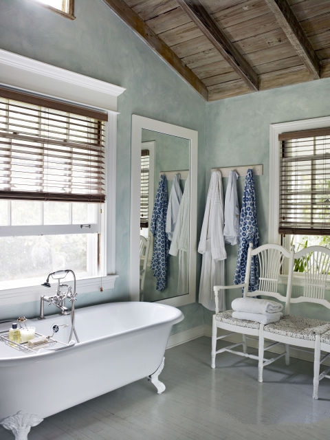 17、在这种棕榈海滩的房子,主人浴室的墙壁被漆成蓝绿色。房主选择了铸铁爪足浴盆,因为觉得它“非常友好”。