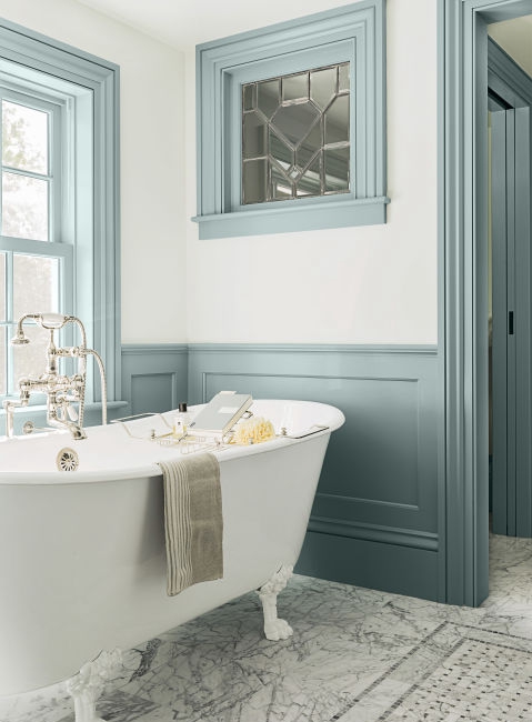 14、设计师选择了蓝色的主基调,辅以灰色瓷砖装饰浴缸上的墙壁,显得不单调。