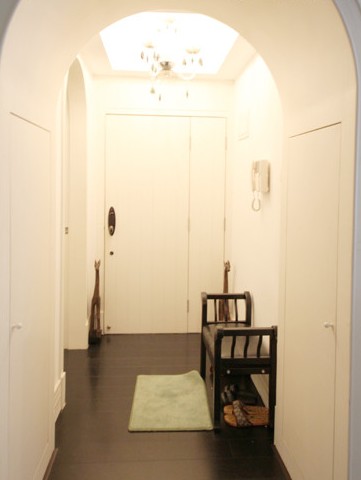 白色的墙面是为空间带来宽敞、光亮效果的永恒手段。而在玄关处拱形的门框设计正好作为空间的分隔之用,加上纯白色的运用,增加玄关的明亮度,使房子的玄关处显得宽阔、光亮。