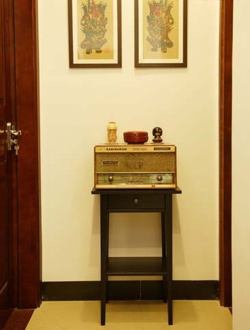 细小的玄关处摆放装饰物品的技巧不易繁杂,点到即止为佳。别有韵味的老式收音机,表面摆上2个日本娃娃,中间摆放的双喜香薰缸,简单而有意思。