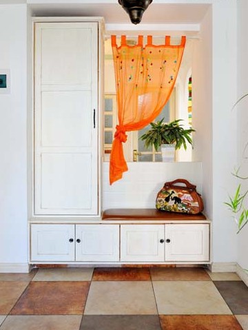 组合型的收纳柜,摆放在玄关处也显得极为合适。柜面是皮质的软包,为了方便换鞋坐着舒服。鲜橙色的窗帘更是成为玄关的一抹亮丽的风景。