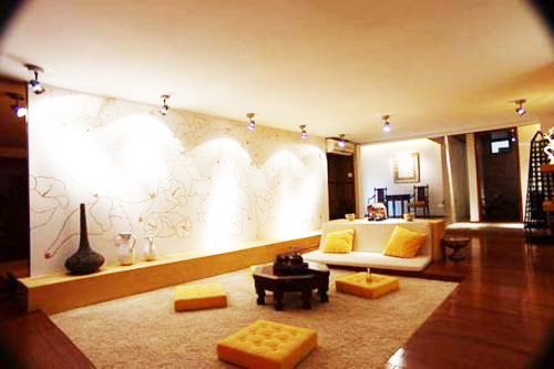 射灯可安置在吊顶四周或家具上部,也可置于墙内、墙裙或踢脚线里。光线直接照射在需要强调的家什器物上,以突出主观审美作用,达到重点突出、环境独特、层次丰富、气氛浓郁、缤纷多彩的艺术效果。射灯光线柔和,雍容华贵,既可对整体照明起主导作用,又可局部采光,烘托出节日的气氛。