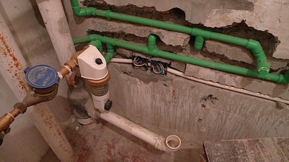 前置反冲洗过滤器。用于过滤水中的铁锈/渣滓/沉淀物等对身体有害的东西. 在安装的时候 十分庆幸自己选择了这个,进水总管调换的时候 手指头伸进去…拿出来就不见了… 全是…..#000000 这个颜色.. 加上一些#2e0d09 这种颜色…自己去PS里面看吧…不堪入肚阿..而且这些残余物品对家里的水管/热水器/龙头/洗衣机的危害是很大的~ 不管经济允许不允许一定要装,不然到最后苦的是自己. (每个月打开反冲洗开关的时候,都很欣慰..看到滚滚而出的脏水..眼泪哗哗的…)