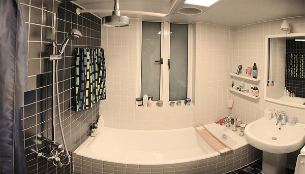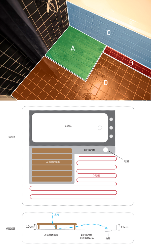 总面积只有4平方的浴室分淋浴区,185全尺寸浴缸,洗手台,马桶。