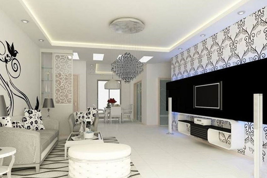 客厅一般不要布置得太有个性。可以选择淡色小花的墙纸,这样会把居室空间显得大一些。背景墙的 色彩搭配则要与家具相适应,但要注意所用颜色不要超过三种,否则会显得很乱。