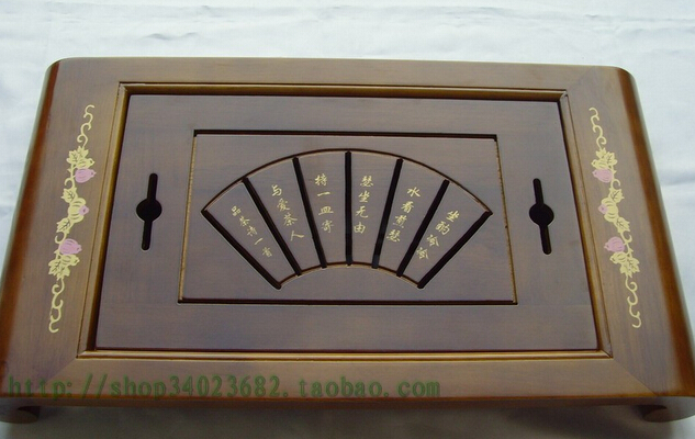 2、这款木制茶具托盘做工精细,茶盘的四周均订有铜脚,不仅增添了朝那的实用性,更增添了其美观性。木制茶具托盘上有着精美的雕刻,茶盘的中间刻有唐诗,其笔供细腻,栩栩如生,使茶盘看起来更具艺术性,增加品茶时的乐趣。茶盘面板设有小圆孔,方便取拿面板,清洗更加容易,且增加茶盘的美观性。茶盘面板使用栅格间隔设计,便于摆放茶具,且使茶盘流水流畅,避免茶盘积水。这款木制茶具托盘价格为:58.5—166元。