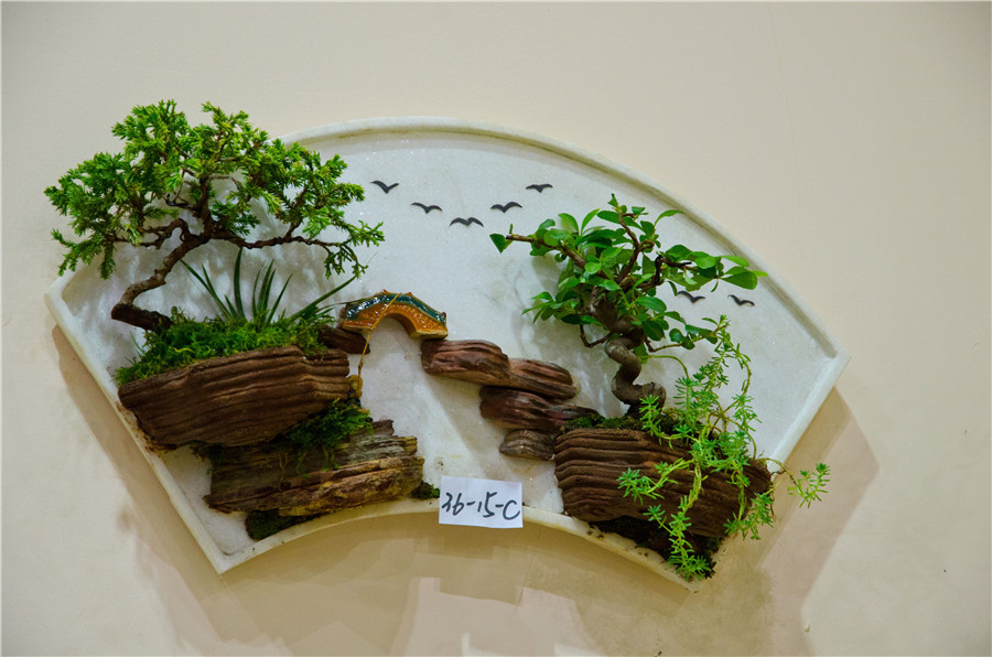 挂壁盆景是盆景工作者将传统的盆景艺术同贝雕、树皮画等工艺美术品制作技艺和形式巧妙结合,并吸收国画、书法艺术精华而产生的一种新型的盆景艺术品。