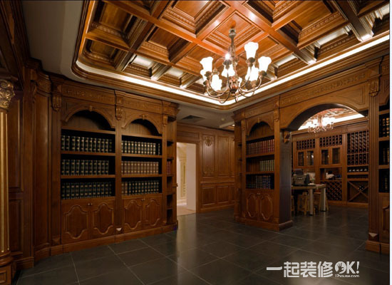 书房天花板四周用实木装饰,而天花板中间没有任何装饰,这刚好与整个书房的装修风格相搭配,这种现代简约风格的可以看出主人的那种休闲、养心等生活方式,这样没有一丝凌乱、复杂的视觉感恰好看出了主人的个性。当然,天花板的吊灯也是一大特点,在这简约的装饰中而又有一颗点缀的星,简约而不失美感。