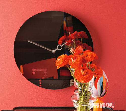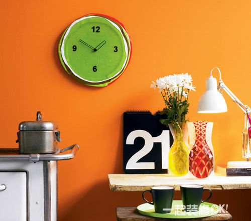 绿色的挂钟其色彩如水果般诱人,给人一种清新的感觉。与橙色墙面的对撞配色显得如此顽皮,增强了居室的热闹与缤纷,同时也提升了空间的整体热度。