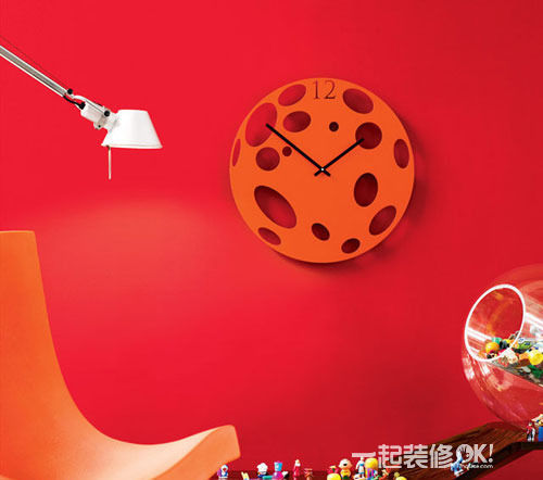镂空的盘面因为灯光投影的关系,而让原本平面的物体有了立体的视觉效果。橙色钟面搭配黑色的指针,显得更加鲜亮耀眼,律动的色彩为家爆发热情。