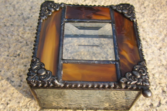 导购理由:首饰盒周边采用彩色玻璃,四角用浮雕浅草纹装饰,底部装饰铜珠脚,适合放置戒指、耳环等小件首饰。