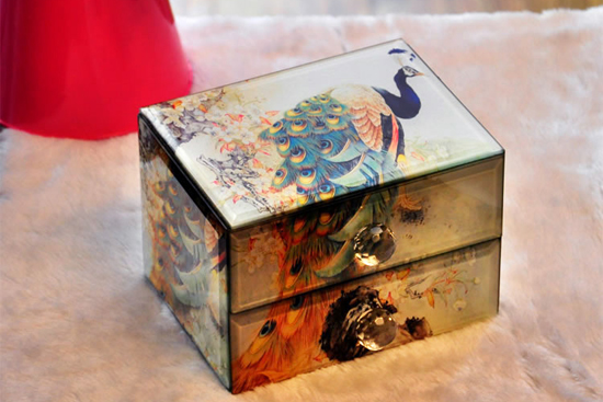 导购理由:精致的水晶玻璃首饰盒,唯美的手绘孔雀图案,透露出别样的风情,欧式宫廷范十足。