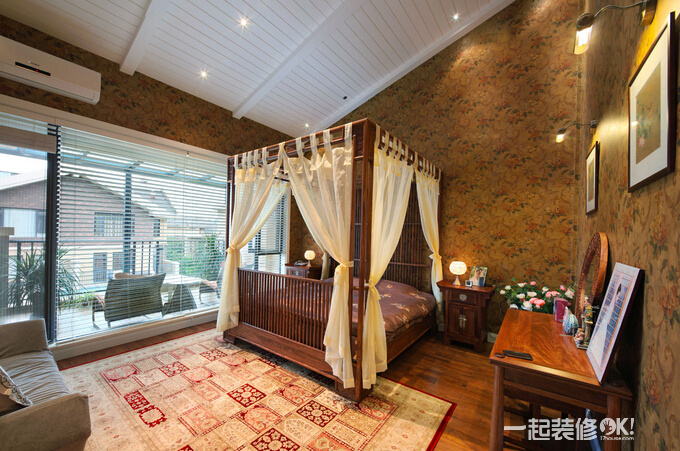 这张卧室阳台隔断效果图中的卧室和阳台的设计比较有意思,整个隔断是推拉式设计,正对着床的,这样整个房间光线最集中的地方就是床了,而且侧面的墙也开了一个小小的窗户,床放在这里最好的就是即便躺在床上也能够将室外的情况一览无余,而且实木的隔断设计也显得特别有质感。