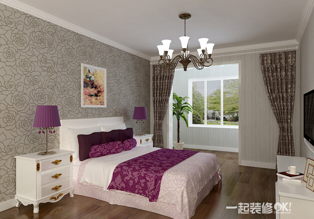 这张卧室阳台隔断效果图中的隔断是一个推拉门设计,不过还是安装了一套落地窗帘,这样的隔断也不会影响到室内光线,躺在床上正好可以透过窗户看到户外的景色,欧式风格的隔断设计也与整个室内的风格很搭配。