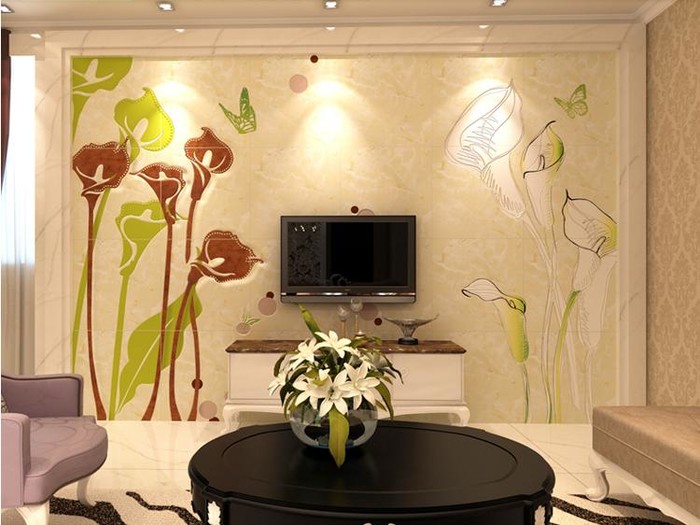 电视背景墙彩绘—电视背景墙作为客厅装饰的一部分,它在色彩的把握上一定要与整个空间的色调相一致,如果电视背景墙色系和客厅的色调不协调,不但会影响感观,还会影响情绪。电视背景墙的选择一定要结合电视柜,茶几,沙发以及窗帘的色系来选择,一般来说,选择接近色系会显得比较和谐统一,一般来说,电视背景墙不易选择太重太深的颜色。