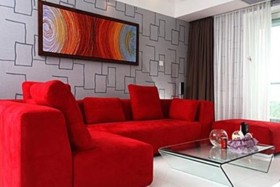 沙发选用了红色的,因为很喜庆,颜色跟墙上的壁画也算遥相呼应,很和谐嘛。