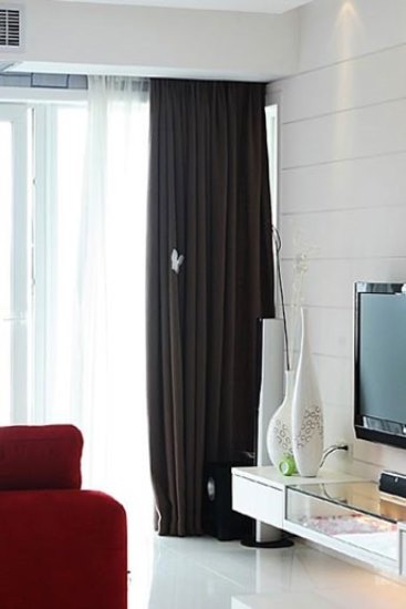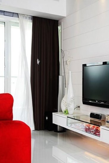 窗帘和壁纸很素,一点不张扬电视柜上的白色长颈花瓶很艺术,能很好的体现主人的品味。