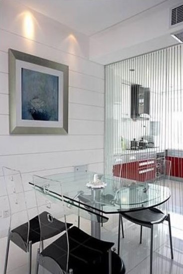 很有特色的厨房,因为很少做饭,所以选择用玻璃做隔墙,然后外面挂上珠帘。