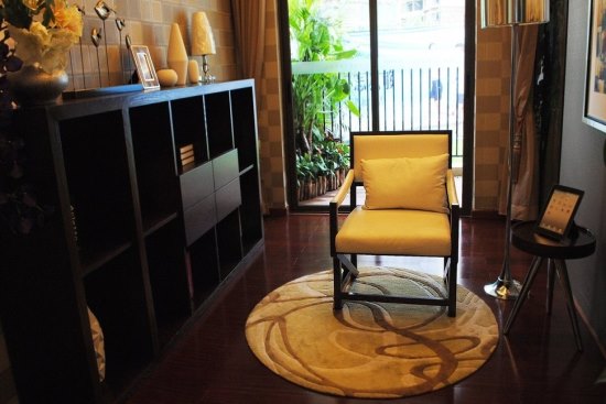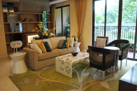 绿色地毯配以镂空设计茶几,如在家居内开出自然小花;黄绿色的抱枕,大地色系沙发,将绿色怡然生活搬入室内。