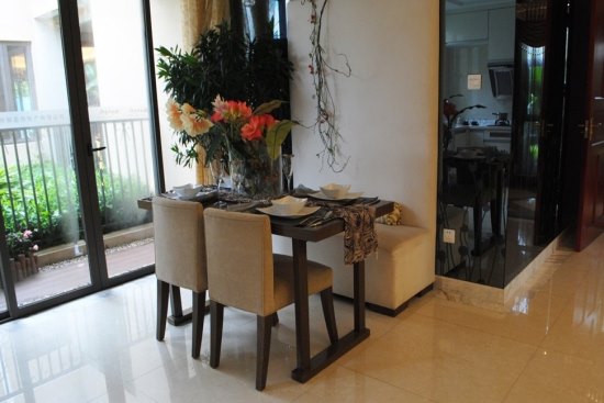饭厅坐具设计颇有风格,除一般的单人座椅外,还配有连体低坐式沙发,四人用餐可享家庭了,二人用餐可肩并肩享二人世界。