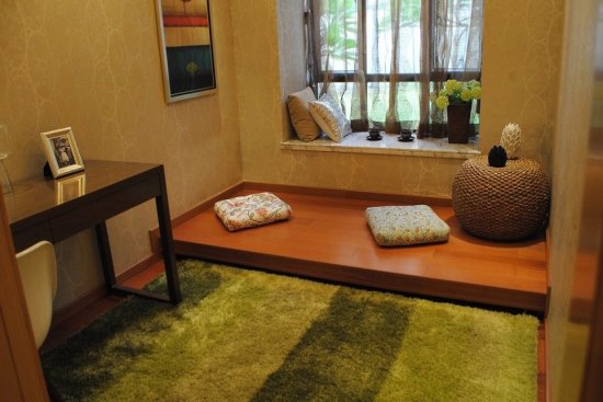 会客书房设计别具一格,高出一层原木地板,可坐可躺,小飘窗设计,可放置书籍亦可放置装饰单品,实用美观双宜。
