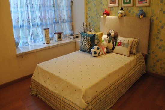 小主人房拥有飘窗设计,可用于放置小主人的“小收藏品”;绿色墙纸设计,活泼而淡雅。