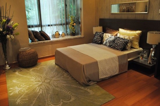 主人房飘窗外依旧绿意盎然,休闲宜居窗外可享;窗内设计大方,原木地板、绿色地毯,主人可赤脚在房间中走动,免除鞋具束缚,放松身心。