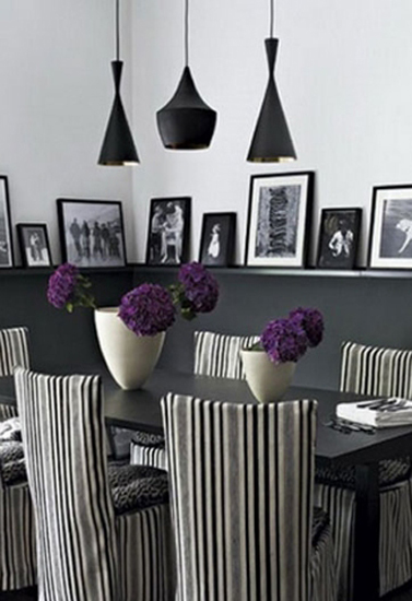 欧式风格餐厅黑白灰三元素再搭上深紫色的花朵组成的用餐空间,前卫时尚的同时也深深地透漏出庄严稳重的气息。深紫色的花朵把整个空间点亮,流露出活泼的一面的同时不失稳重的大基调。