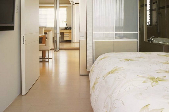弹性通道-在更衣室旁藏有拉门,未来有小宝贝时,主卧与现在的客房,马上能调整为易于照顾幼儿的亲子房;小朋友长大后,需要自己的私人卧室,只要再将拉门关上,就能独立出小孩房使用。