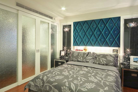 主卧床头-挑选鲜明跳色下的菱纹绷皮,搭配两侧的银框黑镜,品味奢华之最。而滑动门的隔断设计,就将卧室跟外面隔开,形成一个独立的空间。