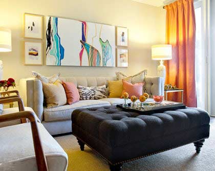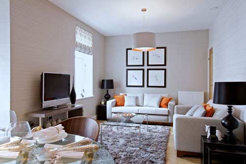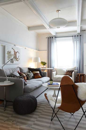 除了巧妙的布局,配色似乎成了打造精致小客厅主要手法,案例中的配色一目了然,白色、黑色、灰色等无彩色最后用橙色巧妙点缀。而这样的点缀只需小面积即可,如靠包上、吊灯内的颜色等。