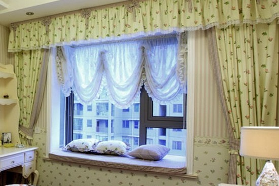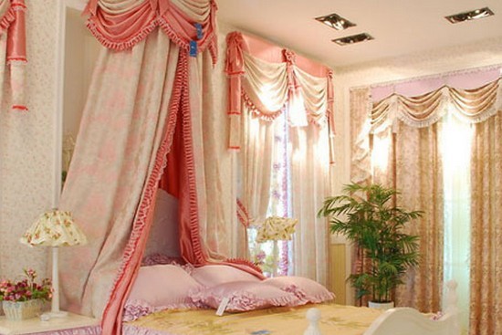 如图中的这种卧室,在这种窗帘的搭配之下,看起来格外的有美感,特别的独特,非常浪漫,有种俄罗斯的浪漫风格,又有一种甜蜜的公主房的味道,非常的华丽,非常可爱。