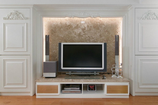 双层电视柜采长宽比例放宽的手法,在电视墙后方的石材在灯光烘托下,展现不凡气势,也让新古典相当重视的对称手法不被遗忘。