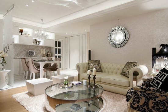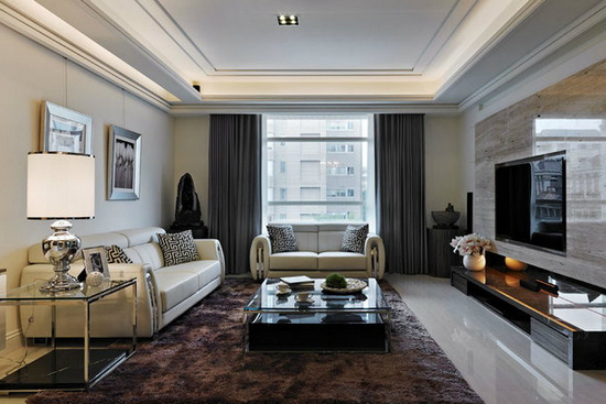 客厅以珠光白的宫廷花壁纸铺陈,细致的纹理呈现浪漫唯美的设计精神,天花板饰以间接灯光,透过多层次的线条演绎出细致优雅的古典氛围。