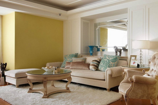 沙发背墙镜子两侧的柜体门片也设计成白色长型百叶造型窗,充份融和美式乡村和新古典风格的精神。