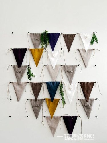 小编的话:制作难度不高,即使没有缝纫机,用手工缝制也很简单,按照一个固定模型裁剪好一个菱形布料,对折之后将一条串联线缝在对折的腰线中,最后通过粗线和钉子固定在墙面上,布料的颜色、花纹可依据自己的旧衣物情况酌情选定,建议色调统一,颜色不要超过4种。另外,每段线头的尽头可以系上一些装饰性物品,比如布偶,松枝等,更有田园风格。