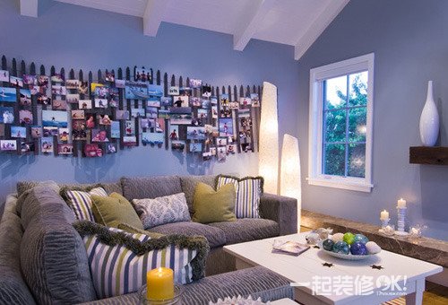 小编的话:这个客厅墙面装修设计时使用到了一些类似制作篱笆的小木棍,通过打孔之后串联成一条两头固定在墙面上的照片带,对于客厅装修设计来说,这是独特有亮点的一个家居设计加分点。