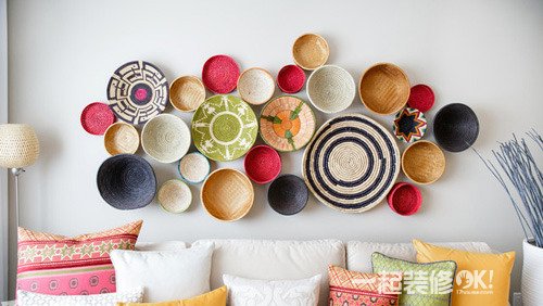小编的话:草编容器的品类也有很多种,最常见的是图中土黄色那一款,是常见的家居厨房收纳用具,辅之以个别色彩鲜明、编织纹路优特色的民族风容器,一极具立体感的3D墙面就搞定了。