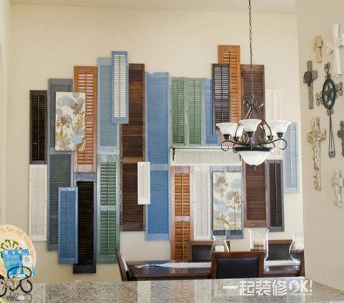 小编的话:要落实这类装修法,首先是要收集到各类尺寸、颜色不一的百叶窗,当你把这些零零散散四处收集来的旧物组装上墙以后,就会收到意想不到的效果啦!图片中的这个客厅墙面装修得益于这种风格明显的设计,成就了家中最亮丽的一角。