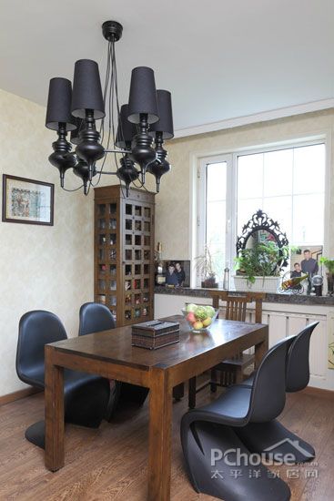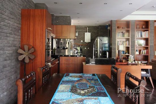 将小工作阳台装上窗户封闭起来,这样原来的厨房位置加上工作阳台就变成一个很大的开敞式厨房,餐厅的装饰上选用了中国特色的青砖,将餐厅,厨房和客厅的书架联系起来,感觉更加一体。