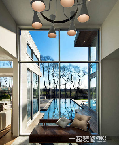 编辑的话:玻璃总是给人一种纯净到骨子里的触感,如果大面积的玻璃出现在家里,会让家更多光线更多宁静舒适。窗外是一个大大的私人泳池,蓝色的池水里映衬这天空跟地面的自然美景,视觉丰富。大面积的落地景观窗则让分美观跑到室内,一个可以躺的沙发更是贴心之举,找个下午窝在这里,看看外面的小景,放松自己。