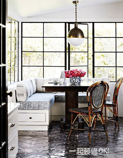 编辑的话:转角的窗户设置保证了室内明亮的空间感,规格统一的窗框整齐划一,很是抢眼。餐区部分的座椅设置考量了整个空间区域,转角的设计也符合整个景观窗的设置。