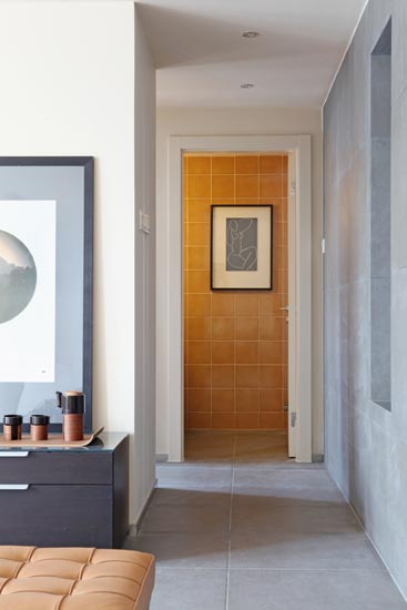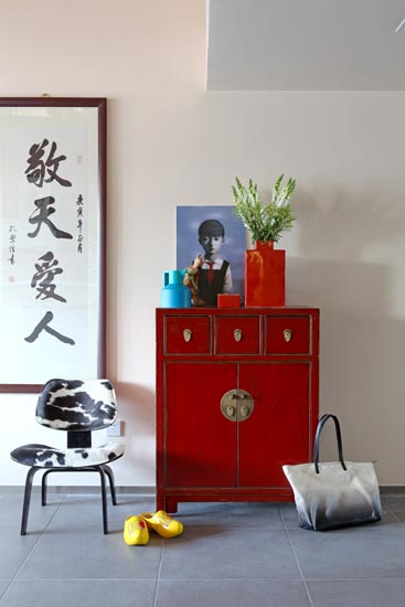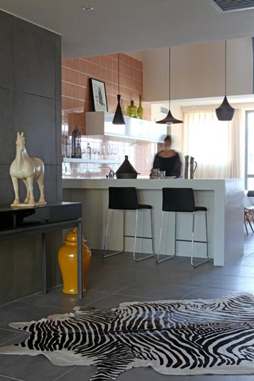 玄关柜上的中式马摆件和地上西式的斑马纹路的地毯对应出一种幽默的气氛。
